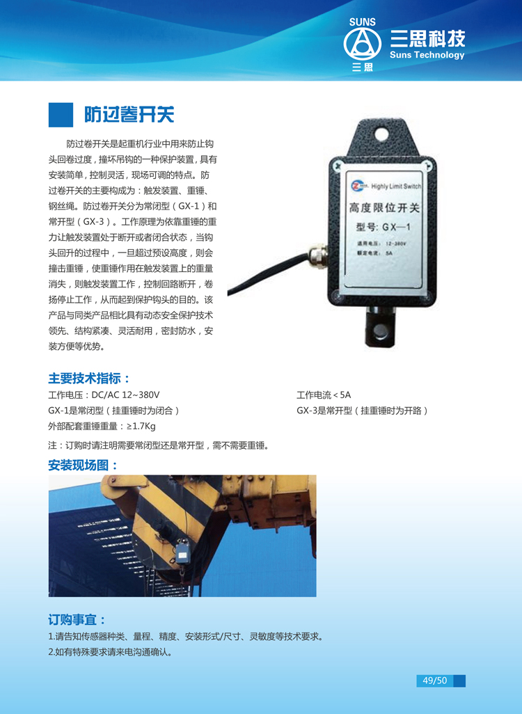 防過卷開關(guān)是起重機行業(yè)中用來防止鉤頭回卷過度,撞壞吊鉤的一種保護裝置,具有安裝簡單、控制靈活、現(xiàn)場可調(diào)的特點。防過卷開關(guān)的主要構(gòu)成為:觸發(fā)裝置、重錘、鋼絲繩。防過卷開關(guān)分為常閉型 (GX-1)和常開型(GX-3)。工作原理為依靠重錘的重力讓觸發(fā)裝置處于斷開或者閉合狀態(tài) ,當鉤頭回升的過程中,一旦超過預(yù)設(shè)高度,則會撞擊重錘,使重錘作用在觸發(fā)裝置上的重量消失,則觸發(fā)裝置工作,控制回路斷開,卷揚停止工作,從而起到保護鉤頭的目的。該產(chǎn)品與同類產(chǎn)品相比具有動態(tài)安全保護技術(shù)領(lǐng)先、結(jié)構(gòu)緊湊、靈活耐用、密封防水,安裝方便等優(yōu)勢。